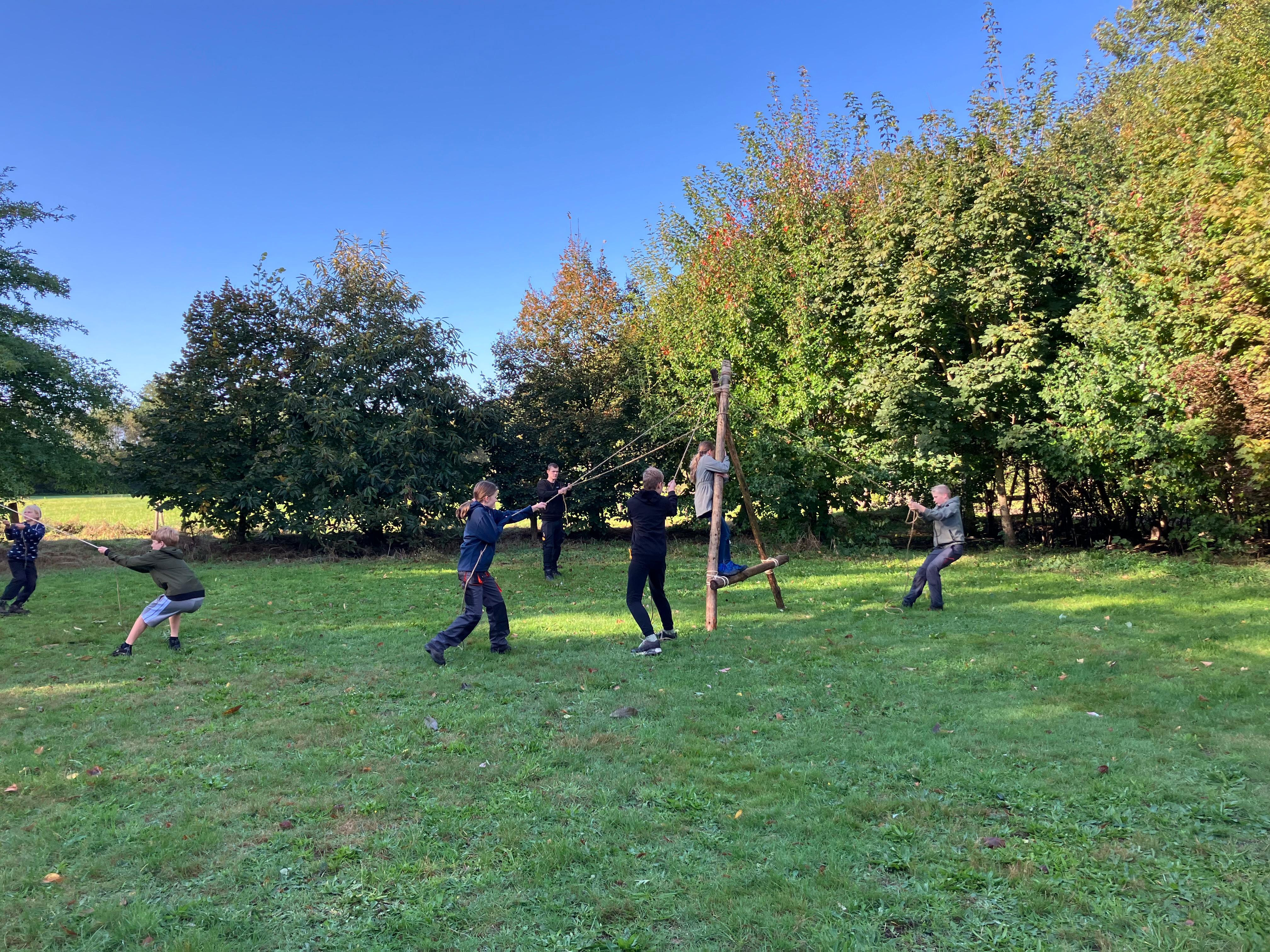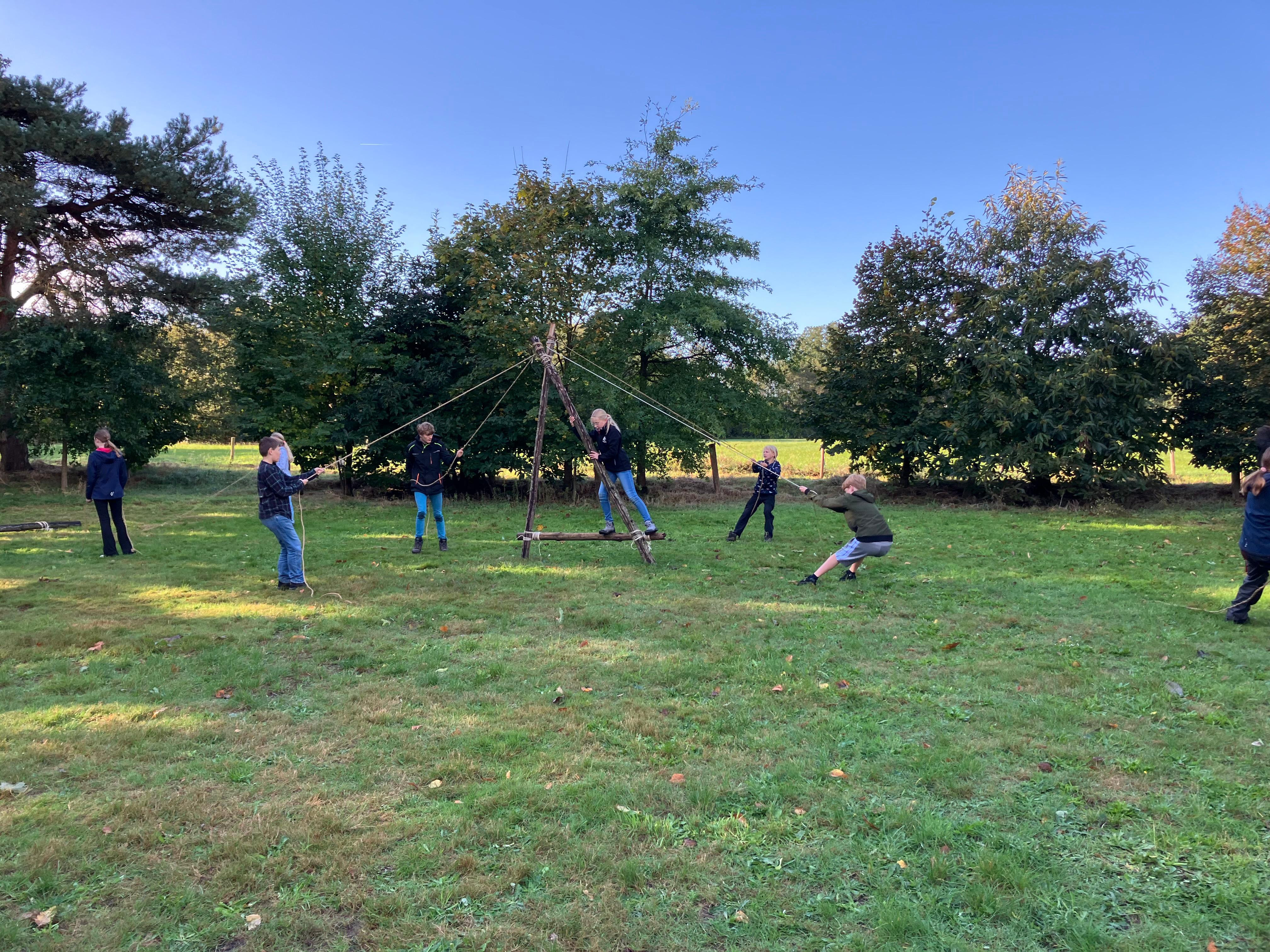 De Scouts gaan er écht op uit. Ze leren zelf vuur maken, pionieren (bouwen met touw en hout), kaart en kompas gebruiken en koken voor hun groep. Denk aan weekendkampen, tochten en eigen projecten. De leiding begeleidt, maar de Scouts nemen zelf steeds meer het voortouw.